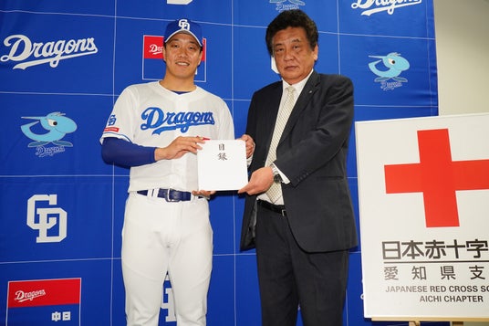 贈呈式が4月17日、バンテリンドーム ナゴヤであり、選手会会長の柳裕也投手が、日本赤十字社愛知県支部の中角竜二事務局長に目録を手渡しました。