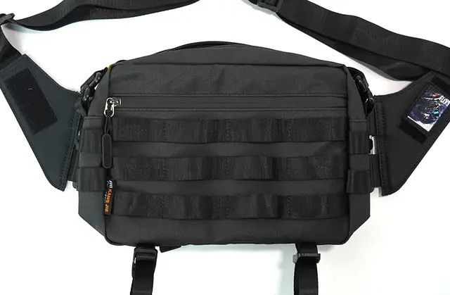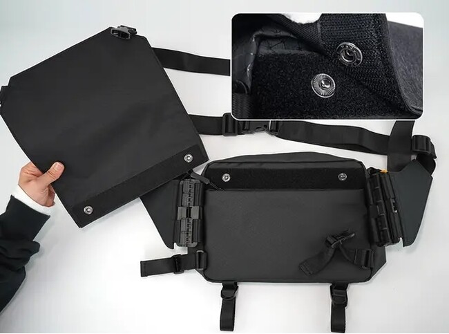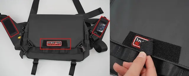 このバッグには外見を自由にカスタムするための仕組みが備え付けられており、3つのマジックテープと2枚のマックテープステッカーが付属しています。
