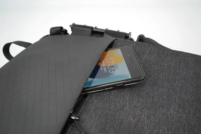 バッグの前面にあるジッパー式のポケットにはスマホや財布などよく使う貴重品を分けて収納刷るのに便利です。
