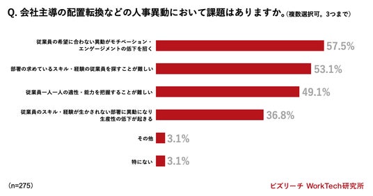 会社主導の異動の課題については、「従業員の希望に合わない異動がモチベーション・エンゲージメントの低下を招く(57.5%)」「部署の求めているスキル・経験の従業員を探すことが難しい(53.1%)」「従業員一人一人の適性・能力を把握することが難しい(49.1%)」という回答の割合が高い結果となりました。会社主導の異動には、社員のスキル・経験の可視化や、キャリアに関する意向を反映する仕組みが必要であることがわかります。