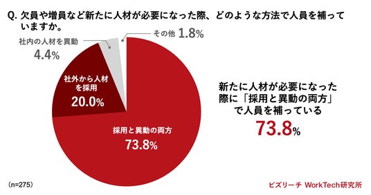 また、新たに人材が必要になった際に、どのようにして人員を補うかをたずねたところ、73.8%の企業が「採用と異動の両方」で人員を補っていると回答しました。このことから、ビジネス環境の変化に応じた柔軟な人材登用の実現にあたり、難度が上がっているキャリア採用における採用力の強化、ならびに社内の人材活用の重要性が増しているといえます。