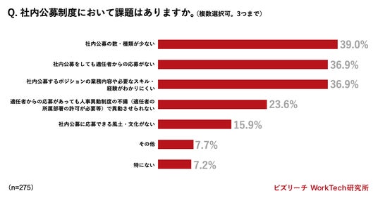 まず、社内公募の課題については「社内公募の数・種類が少ない(39.0%)」「社内公募をしても適任者からの応募がない(36.9%)」「社内公募するポジションの業務内容や必要なスキル・経験がわかりにくい(36.9%)」という回答の割合が高い結果となりました。社内公募には、仕組み・運用面での課題だけではなく、社内公募するポジション要件の言語化にも課題があることがわかります。