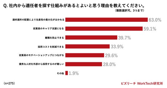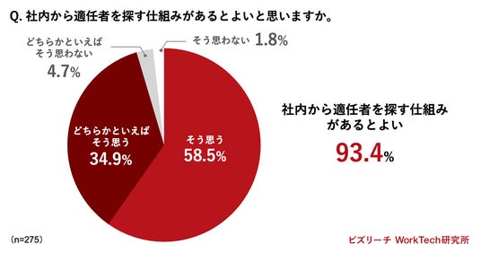 「社内から適任者を探す仕組みがあるとよいと思うか」という質問に対しては、93.4%が「そう思う」「どちらかといえばそう思う」と回答し、その理由を聞いたところ、「適材適所の配置により生産性の最大化がはかれる(63.0%)」「従業員のキャリア支援になる(59.1%)」という回答の割合が高い結果となりました。