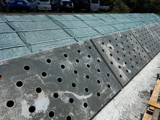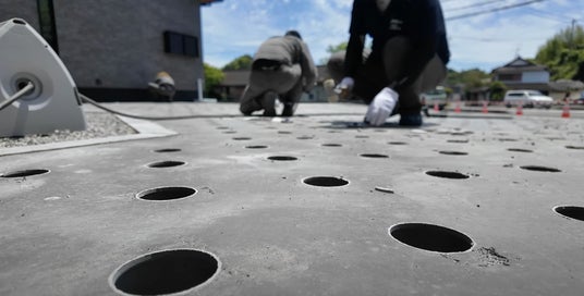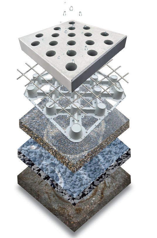 Dotcon工法は、再生ポリプロピレン製のパネル「Dotconパネル」を等間隔で敷設し、その上にワイヤーメッシュとコンクリートを打設するオンサイト型透水性舗装技術です。パネルの孔部を通じて雨水を一時貯留し、敷砂層・路盤層を通して地下に浸透させることで、雨水流出の抑制、ヒートアイランド対策、意匠性の向上を同時に実現します。