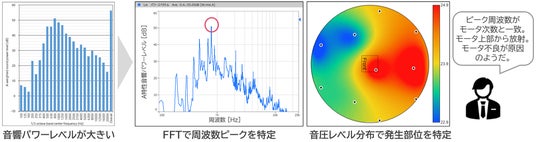 - 騒音の発生源や原因を直感的に把握できるFFT分析や音圧レベル分布表示