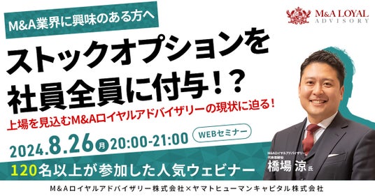 ヤマトヒューマンキャピタル株式会社(本社:東京都千代田区、代表取締役:堀江 大介)は、2024年8月26日(月) 20:00よりオンラインにて、M&Aロイヤルアドバイザリー代表取締役の橋場涼氏にご登壇いただくウェビナー『上場を見込むM&Aロイヤルアドバイザリーの現状に迫る』を開催いたします。