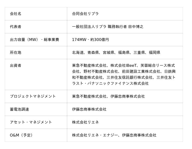 リブラは、当社および三井住友信託銀行株式会社(本社:東京都千代田区、取締役社長:米山学朋)を含む国内8企業による共同出資のもと、特別高圧の系統用蓄電所6物件(総事業費約300億円、出力約174MW)を対象プロジェクトとして、2027年度以降の順次運転開始に向けて推進していきます。