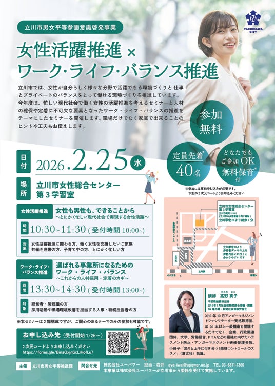 立川市男女平等推進課では、職場における女性の活躍と働く人全てに関わるワーク・ライフ・バランスを推進するセミナーを開催します。