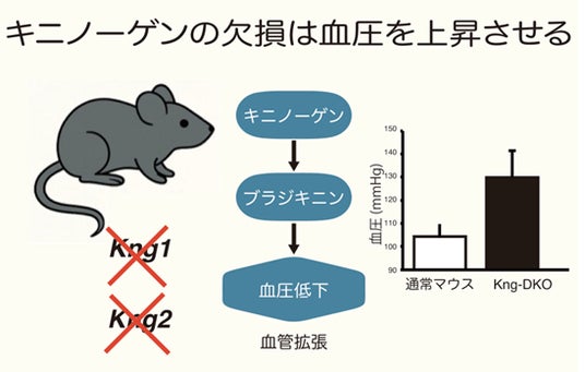 研究概要図:キニノーゲン欠損によるブラジキニン経路の遮断と血圧上昇の概念図。Kng1・Kng2 の両遺伝子を欠損した KNG-DKO マウスでは、ブラジキニン生成が起こらず、血管拡張作用が低下。その結果、基礎血圧が上昇することが明らかになった。