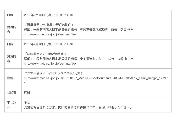 医薬品医療機器等法下における医療機器認証や安全/EMC試験の最近の動向、計測器校正についての最新情報をご紹介するほか、会期中は個別相談も随時対応いたします。
