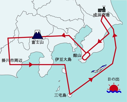 本フライトは、2026年1月1日(木)の元旦に、当社が保有する「HondaJet」を使用し、成田国際空港を出発・帰着する遊覧飛行です。南房総の美しい海岸線を眼下に眺めた後、富士山や伊豆諸島を周遊するコース(※1)を予定しています。