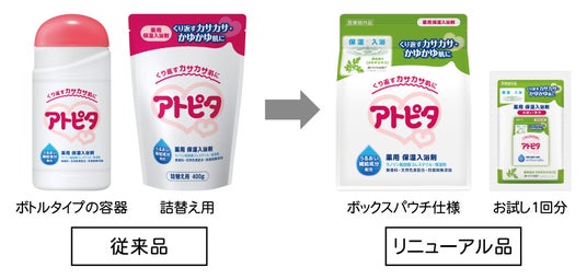 従来のボトルタイプの容器・詰替え用から環境に配慮した「ボックスパウチ」へ変更しました。使用後の保管に便利なチャック付きで、付属のスプーンで計量もしやすくなりました。初めて入浴剤を手に取るお客様が手軽にお試しいただけるよう価格の見直しも行った他、『お試し1回分』を新発売。これまでよりも多くのお客様にアトピタ入浴剤の魅力を実感していただきやすくなりました。