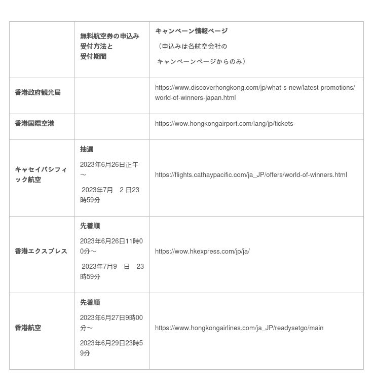 日本の旅行者を対象とした募集は、6月26日(月)から始まります。キャンペーンの詳細は、香港政府観光局のウェブサイト(https://www.discoverhongkong.com/jp/what-s-new/latest-promotions/world-of-winners-japan2023.html )と「ワールド・オブ・ウィナーズ」公式ホームページ(https://wow.hongkongairport.com/tickets )、各航空会社のキャンペーンページで確認いただけます。