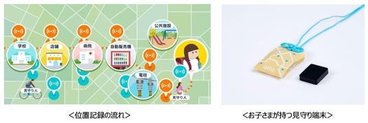 この見守りネットワークでは、小型かつ最長6年の電池寿命となる専用の見守り端末を所持するだけで所持者の位置が記録されるため、利用者に負担をかけず手軽に利用できる見守りサービスを実現します。記録された位置情報は、保護者が利用するアプリを通じて通知や確認ができ、さらに警察など公的機関と連携し、万が一の際の捜索活動を支援する取り組みも行っています。