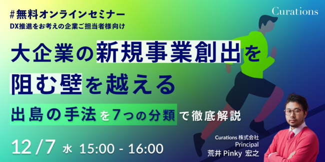 顧客企業のビジネス変革を成功に導くキュレーションズ株式会社(本社:東京都渋谷区、代表取締役社長:根本隆之、以下当社)は、『大企業の新規事業創出を阻む壁を越える~出島の手法を7つの分類で徹底解説~』を2022年12月7日(水)に開催いたします。