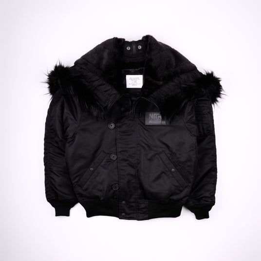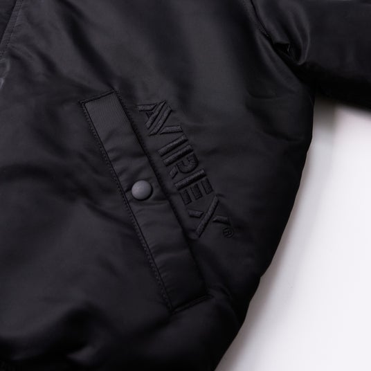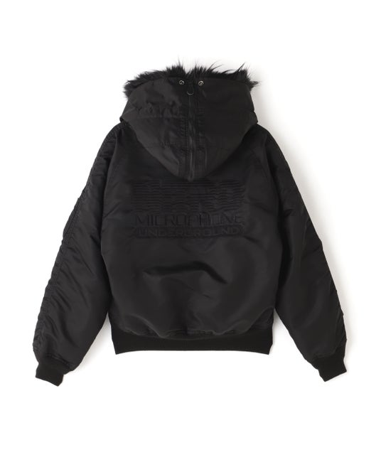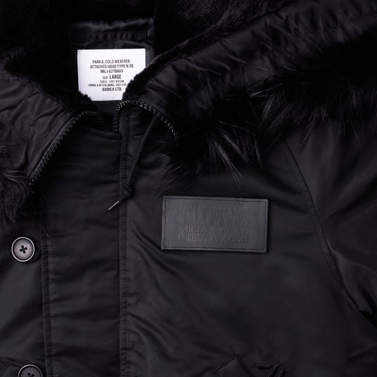 第三弾コラボレーションは本物のフライトジャケットを作り続けてきたAVIREXが、コマーシャル(民間向け)用に生産し、現代にマッチするシルエットにアップデートした「N-2B」をベースに「NMU」のシグネチャーロゴを同色で背中に刺繍。フロントには「NMU」ロゴ入りパッチをオン。フードのファーもボディと色を合わせ、NMUコラボらしい黒を基調としたデザインとなっている。