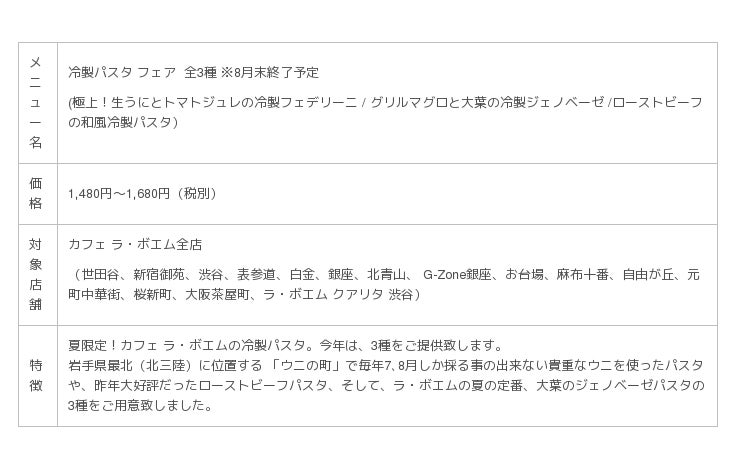 イタリアン業態「Cafe La Boheme(カフェ ラ・ボエム)」「La Boheme Qualita(ラ・ボエム クアリタ)」は、7月3日から夏限定「冷製パスタ フェア」スタート致します。