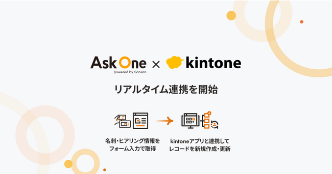 またAsk Oneでは、Sansanの名刺データ化テクノロジーを搭載した唯一のフォームとして名刺に特化した独自のエンジンを搭載しています。今回の連携によって、展示会や訪問営業時などオフラインの接点の場で取得した名刺情報とヒアリング情報をリアルタイムにkintoneへ連携できるようになり、オフラインの接点においてもアフターフォローを最速化していただけます。