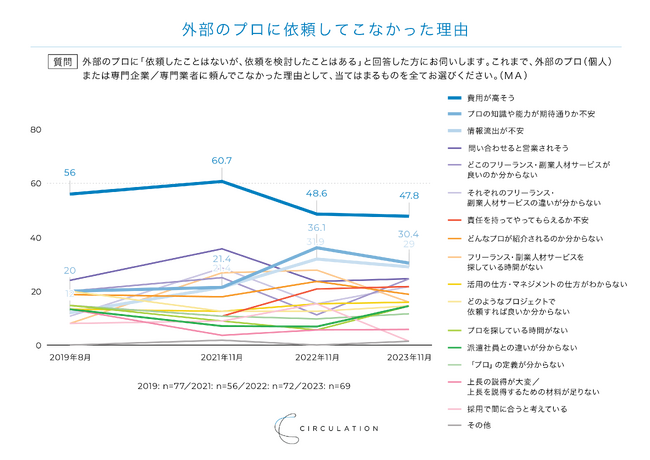 2019年8月からの経年変化を見ると「費用が高そう」は1位を保ちつつもここ2年で10%近く低下しています。特に目立つ上昇は「情報流出」で、昨年から10.9ポイント上昇し、セキュリティへの不安が外部のプロの利用を抑制している可能性が高まっています。また今回は「採用で間に合う」という回答がわずか1.4%となり、採用と外部のプロのニーズが明確に区別されるようになった可能性も考えられます。
