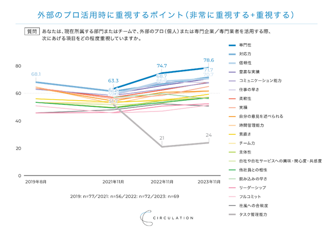 2019年8月の調査開始からの経年変化では、2021年の設問追加により「専門性」「信頼性」「対応力」が要求されるようになりました。一方「タスク管理能力」は非常に重視する割合に変動はないものの、唯一全体的な重視度が2分の1まで急激に低下しています。