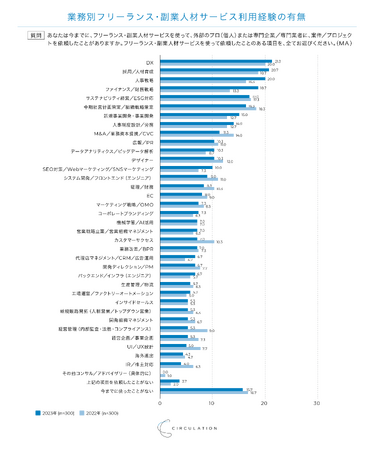 最も多かった業務は、2022年同様「DX」で、21.3%の回答者がフリーランス・副業人材サービスを経由して依頼経験がありました。次いで「採用/人材育成(20.7%)」「人事戦略(20.0%)」が高く、ファイナンス/財務戦略、サステナビリティ経営/ESG対応がこれに続きます。全体的な回答傾向と比較すると、過去5年間の依頼内容は「DX(52.6%)」「採用/人材育成(50.7%)」「広報/PR(47.6%)」が上位3位で、システム開発、経理/財務が続いています。これから企業がフリーランス・副業人材サービスを活用する際には、DXや人事戦略など、経営戦略への理解が求められる職種でプロを探す際に活用されていると考えられます。