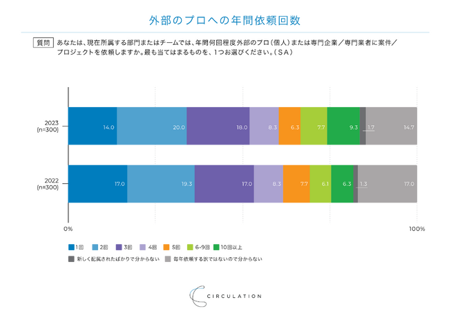 2022年から大きな変動はないものの、依然として年間で複数回以上外部のプロを利用する企業は69.6%であり、大多数を占めています。回答者の中で「10回以上」と回答した割合も6.3%から9.3%へと増加しました。また、「毎年依頼するわけではないので分からない」と答えた割合も2022年に比べ2.3%減少しており、外部のプロの利用が定着しつつある兆候が見られます。