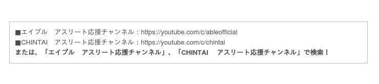 かねてより、エイブル&パートナーズは、スポーツ支援を通じ、「健やかなくらしと夢を持ち頑張る人々」を応援してまいりました。夢へ向かって頑張る選手を通して、未来を創造する「きっかけ」や「気づき」を与え、自分らしい暮らしに近づけるサポートができればと考えております。動画はエイブルまたはCHINTAI の公式 YouTube チャンネルから、どなたでも無料でご視聴可能です。ここでしか見ることのできないアスリートの「今」を、ぜひご覧くださいませ。