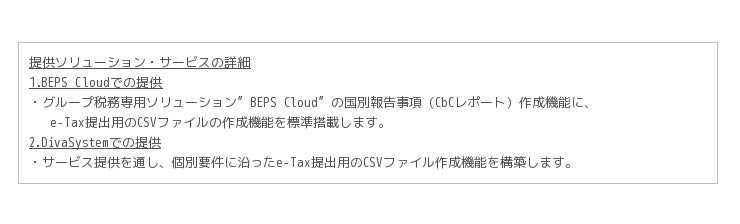 ディーバは、今後もDivaSystem・BEPS Cloudを活用したBEPS対応の効率化、お客様のご要望を反映した製品開発、保守サポートサービスの充実を推進して参ります。