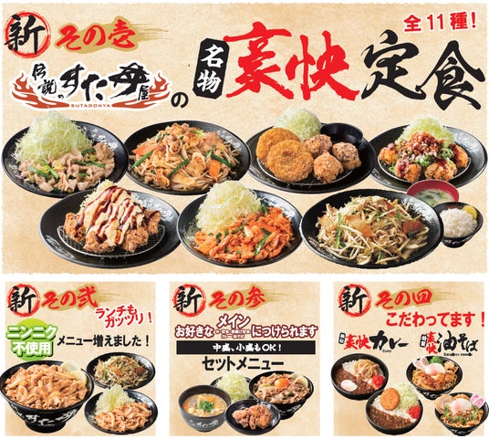 しかし、ただお客様にご負担をおかけするばかりでは申し訳ないと思い、この度グランドメニューを大幅に変更し、ニンニク不使用のメニューや定食メニューのバリエーションを増やすことにいたしました!さらに、1度の食事で色んなものを食べたいという方のために、今まで「すた丼」にしかつけられなかったお得な“セットメニュー”がお好きなメインメニューにつけられるようになり、自分好みにカスタムすることが可能となります!「旨いものを腹いっぱい食べて頑張ってほしい」という創業者の想いを受け継ぎ、これからもお客様のニーズに応え続け、明日への活力となる商品を提供してまいります。
