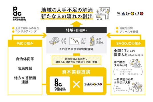 全国の自治体と連携し、自治体伴走に取り組むPdC社とSAGOJO社が業務提携および資本提携を行うことで、これまで両社が取り組んできた人材の環流および地域課題の解決をさらに加速化させ、持続可能な地方創生の仕組みを全国に展開することを目指します。