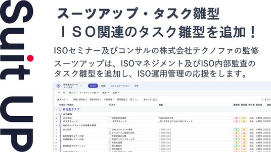株式会社スーツ(所在地:東京都千代田区、代表取締役社長CEO:小松 裕介)は、チームでかんたん、毎日続けられるプロジェクト・タスク管理ツールの経営支援クラウド「Suit UP」(スーツアップ)において、株式会社テクノファ(所在地:神奈川県川崎市、代表取締役:須田 晋介)が監修するISOマネジメント及びISO内部監査などISO関連のタスク雛型を追加したことをお知らせします。
