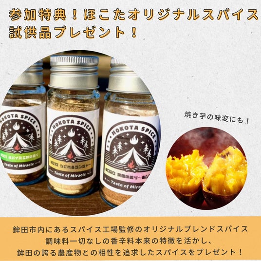 鉾田市内にあるスパイス工場監修のオリジナルブレンドスパイスを開発!調味料一切なしの香辛料本来の特徴を活かし、鉾田の誇る農産物との相性を追求したスパイスとなっています。国内最速で試食できるチャンス!なんと試供品は持って帰れます!