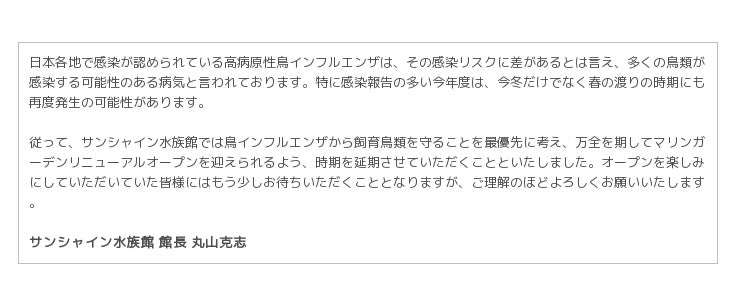 今年度、北海道から鹿児島県にかけて全国的に拡がりをみせている高病原性鳥インフルエンザは、18道府県171件と例年になく多い発生状況となっております(1月10日現在の確認件数)。更なる感染が拡がることも考えられ、当初リニューアルオープンを予定していた春の時期では終息を迎えていない可能性があるとの結論に至りました。