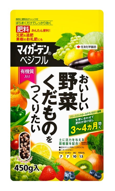 野菜やくだものの元肥や追肥にばらまくだけで使える粒状肥料商品名:マイガーデンベジフル