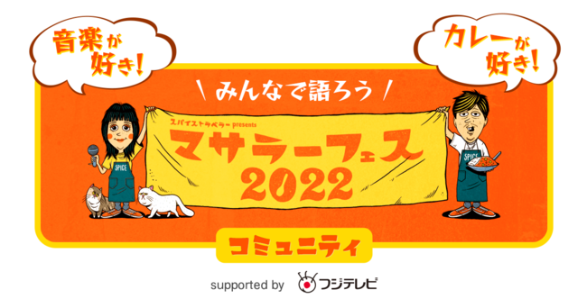 株式会社フジテレビジョン(本社:東京都港区、代表取締役社長:金光 修、以下フジテレビ)と、クオン株式会社(本社:東京都港区、代表取締役:武田 隆、以下クオン)は、来月21日にぴあアリーナMM(横浜みなとみらい)で開催される「スパイストラベラーpresentsマサラーフェス2022」に向けて、カレーと音楽について語り合えるコミュニティサイト「マサラーフェス2022コミュニティ」(https://www.beach.jp/community/SPICETRAVELERS)を本日3月17日(木)にオープンいたしました。