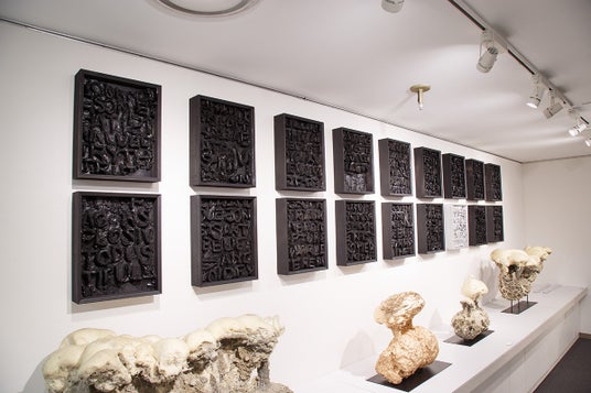 彫刻では文字をテーマにした作品や、爆薬にて衝撃波を起こし制作する「衝撃波彫刻」を制作している。