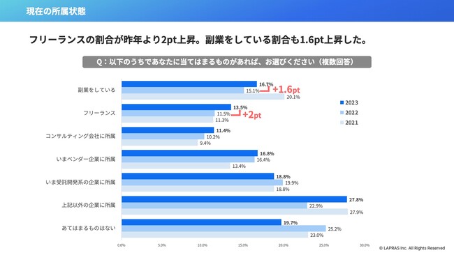 現在の所属について聞いた結果、昨年と比べフリーランスが2pt、副業が1.6pt上昇していました。副業やフリーランスとして活動するエンジニアが増加していることがわかりました。