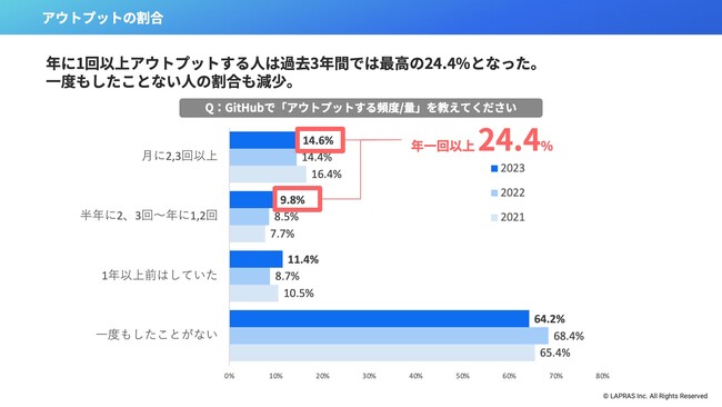 年に1回以上アウトプットするエンジニア(*1)の割合は過去3年間で最も高い24.4%となった。