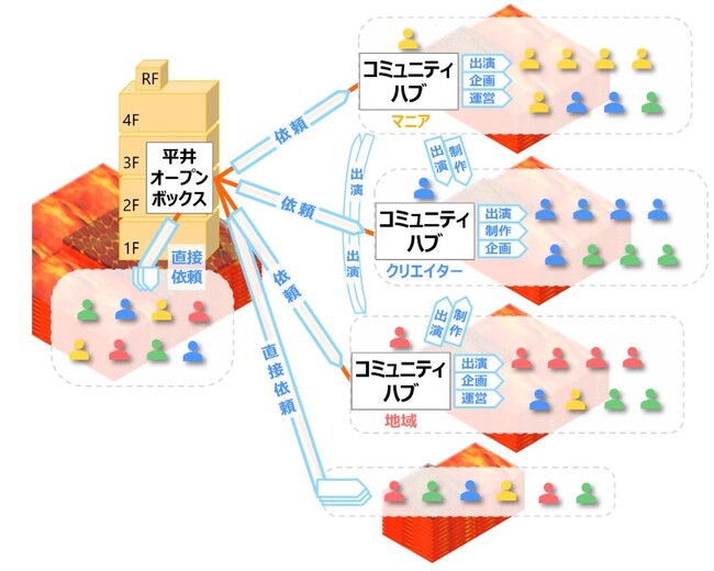 平井オープンボックスでは、参加している会員や関連する企業間で、相互にお仕事の依頼・連携が生まれる仕組みで運営を進めていきます。マニア、クリエイター、地域で活動されている方の中から「コミュニティハブ」と呼ぶ中継する役割を設けます。コミュニティハブ、別視点、他の会員からお仕事の依頼が起こり、活動の熱量がより大きくなっていくことを推し進めます。