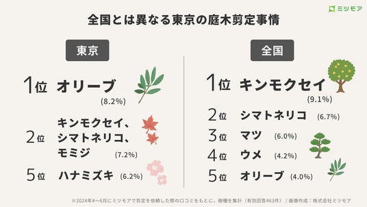 その結果、東京都では全国傾向と異なり「オリーブ」の剪定依頼が1位となり、全国で最多のキンモクセイとは異なる傾向が見られました。5月には剪定依頼が増加する季節特性や、地域によって異なる剪定樹種など、日本の庭木事情を紹介します。