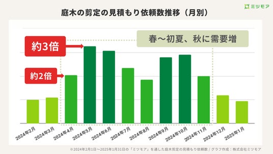 春から初夏にかけては庭木が大きく成長する時期です。気温の上昇に伴って、剪定の見積もり依頼も全国的に急増します。昨年は、4月に入ると3月の約2倍、5月には約3倍と、一気に需要が高まりました。中でも5月は1年の中で最も依頼件数が多く、剪定サービスの"繁忙月"となっています。