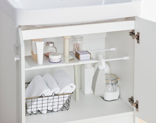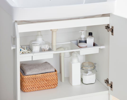 洗面台下やシンク下をスッキリ整頓。ご自宅に設置したつっぱり棒の幅や用途に合わせて、4種類のアクセサリーから置き方のバリエーションを選択できます。さらにアクセサリーの底面には、つっぱり棒にフィットする窪みがあるため、落下するリスクを軽減し、自分のスタイルに合わせた使い分けが可能です。
