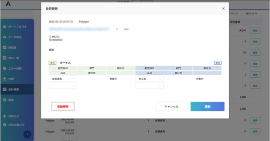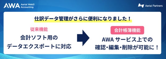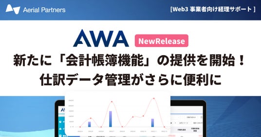 2024年5月20日、デジタルアセットの会計・税務・データ管理サービスを提供する株式会社Aerial Partners(本社:東京都港区、代表取締役:沼澤健人、以下:当社)は、運営するWeb3事業者向け経理サポートツール「AWA(Aerial Web3 Accounting)」にて、新機能「会計帳簿機能」の提供を開始したことをお知らせします。