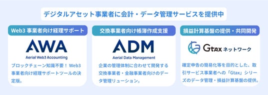 ・AWA(Aerial Web3 Accounting):ブロックチェーン知識不要で利用できる、Web3事業者向けの経理サポートツール。管理の手間を削減し、事業をドライブさせる体制づくりを支援します。