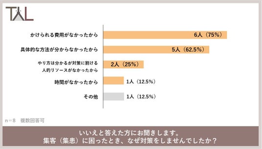 ・これまで集患に困ったことがある動物病院の院長は約半数で、集患に困ったときに対策をした人は約7割という結果に。集患に困ったときの具体的な対策1位は「HP制作、またはリニューアルをした」で、逆に対策をしなかった人の理由1位は「かけられる費用がなかったから」。