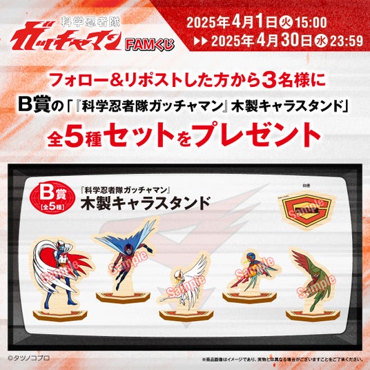 期間中に「FAMくじオンライン」の公式Xアカウント(@FAMKUJI_ONLINE)をフォローし、キャンペーン投稿をリポストすることで、抽選で3名様にB賞の「『科学忍者隊ガッチャマン』木製キャラスタンド全5種セット」をプレゼントいたします。