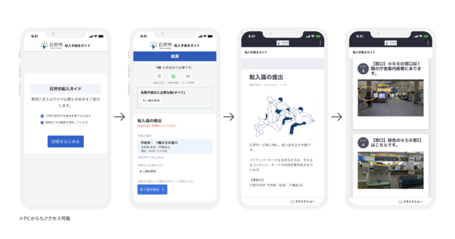 1. 転入手続きガイド:市民が自身の基本情報を入力することで必要な手続きや書類を把握でき、待ち時間の短縮や差し戻しの防止につなげる。