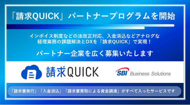 総合フィンテックソリューション企業であるSBI FinTech Solutions株式会社の子会社で、バックオフィス支援サービスを提供するSBIビジネス・ソリューションズ株式会社(本社:東京都港区、代表取締役社長:夏川 雅貴、以下「当社」)は、経理のさまざまな課題を解決し、DXを加速するクラウド型請求書発行システム「請求QUICK」におけるパートナープログラムを8月より開始いたしましたので、お知らせいたします。また、本プログラムの第一号パートナー企業として、株式会社島根銀行(本店:島根県松江市、取締役頭取:鈴木 良夫、以下「島根銀行」)にご参画いただき、山陰エリアにおける中小企業のDXを当社と共同で推進していくことを合わせてお知らせいたします。