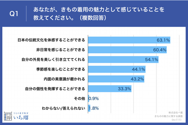 きもの着方教室 いち瑠(https://ichiru.net/)を展開する株式会社一蔵(本社:東京都千代田区、代表取締役社長:河端義彦)は、きもの着用を趣味にしており、1年に数回以上きものを着用している女性111名に対し、「きものの魅力」に関する調査を実施いたしました。