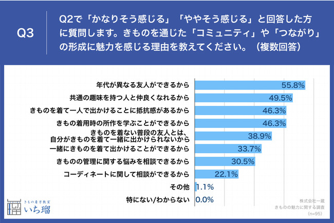 Q2で「かなりそう感じる」「ややそう感じる」と回答した方に、「Q3.きものを通じた「コミュニティ」や「つながり」の形成に魅力を感じる理由を教えてください。(複数回答)」と質問したところ、「年代が異なる友人ができるから」が55.8%、「共通の趣味を持つ人と仲良くなれるから」が49.5%という回答となりました。